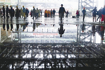 10月30日,随着上海建设者成功吊装上海世博中心屋顶最后一榀梁,实现上海世博中心在建永久性场馆中第一个钢结构封顶的项目,比原计划提前一个月。世博中心是2010年世博会永久性场馆之一,总面积达14.2万平方米,建成后的世博中心将成为世博会运营指挥中心、新闻中心、论坛中心。 张海峰 摄
