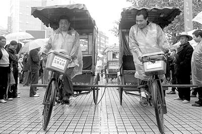 10月30日上午,重庆市荣昌县城莲花广场。在第二个重庆“农民工日”到来前夕,荣昌县的农民工代表冒雨参加当天在这里举行的“农民工趣味运动会”。当天,来自建筑、市政、超市等服务行业的近100名农民工代表,组成10支代表队参加了“人力三轮车拉力赛”、“货物搬运”、“餐花折叠造型”等项目的比赛。 朱芸锋摄