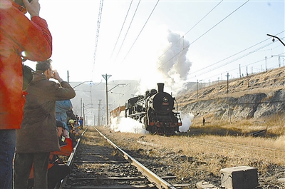 欧洲的蒸汽机车摄影爱好者到海州露天国家矿山公园参观蒸汽机车。 谷满春 摄