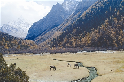 深秋,位于四川省甘孜州的亚丁风景区层林尽染、美景诱人,吸引了国内外大批游客的到来。亚丁属于高山峡谷类风景区,海拔2900至6032米,幅员面积1344平方公里。景区内三大雪峰周围群峰林立,雪峰、冰川、森林、溪流、瀑布、草甸有机地组合成一幅美丽的画卷,被称做是香格里拉之魂。 本报记者 张宪 摄