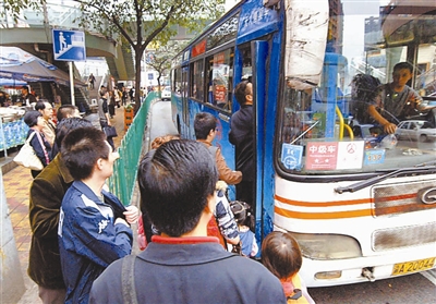 11月4日早晨,重庆市民在临江门一个公交车站有序上车。
