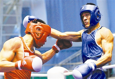 11月4日,在2008年全国男子拳击锦标赛男子75公斤级半决赛中,山东队选手王建政(右)以14比13战胜北京队选手张建艇,挺进决赛。新华社记者 李紫恒 摄