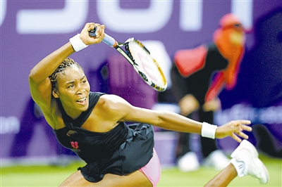 当地时间11月4日,美国选手大威廉姆斯在卡塔尔首都多哈举行的WTA 2008年度总决赛紫组的比赛中,以2比0战胜俄罗斯选手萨芬娜。 新华社发 (陈少金 摄)