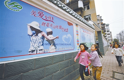 11月5日,几位小学生从宜昌市四方堰社区的文化墙边走过。