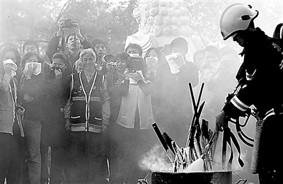 为迎接北京市第十八届“119消防宣传周”活动,提高人们防火减灾意识,该支队在此次活动中先后进行了大厦义务消防员穿着消防服和水带连接表演、现场云梯气垫逃生演习,大厦员工和周围居民近千人参加了此次活动。 本报记者 杨登峰 摄