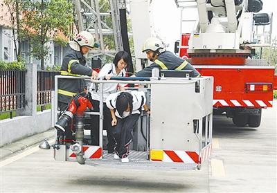 为配合119消防安全日的宣传,组织参加培训的人员到消防驻地参观消防设备,体验消防过程,更是不可缺少的一项内容。日前,重庆永川市消防队员就组织了这样一次活动。图为学生们在消防队员的帮助下进行逃离火灾现场的训练。 陈仕川 摄