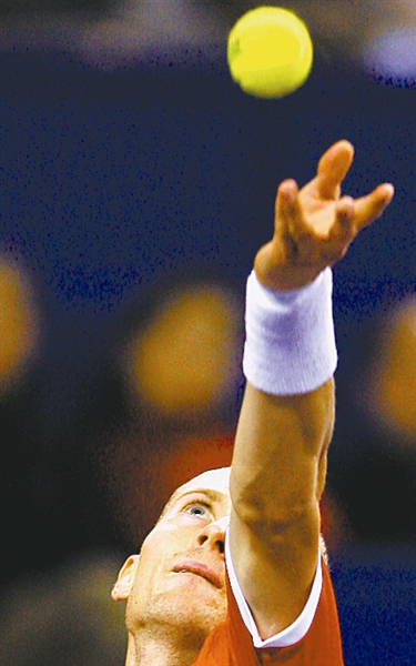 11月9日,在上海旗忠森林网球中心举行的2008上海网球大师杯赛金组的比赛中,俄罗斯选手达维登科以2比1战胜法国选手特松加。 新华社记者 凡军 摄