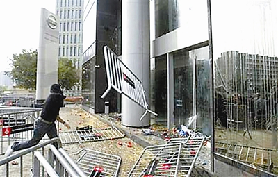 突如其来的金融风暴席卷了整个欧洲。在西班牙首都巴塞罗那,日产汽车公司宣布在当地裁员1680人。图为11月11日,一名员工向公司大楼扔路障以示抗议。阿健 供图
