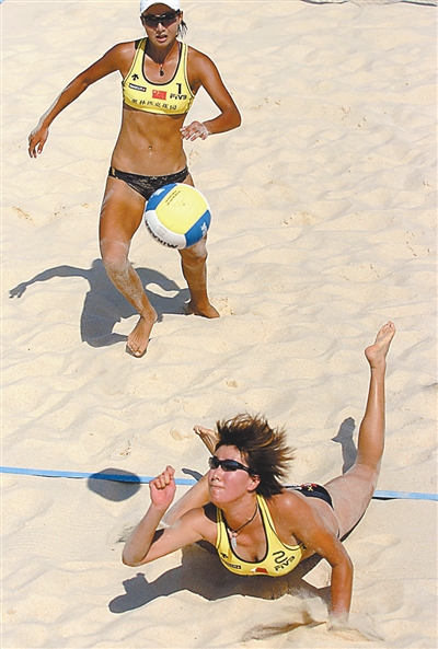 11月13日,在2008世界沙滩排球巡回赛三亚公开赛女子正选赛第一轮比赛中,中国选手黄影(上)/张希以1比2不敌加拿大选手雷萨德/马丁。新华社记者 郭程 摄