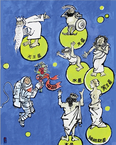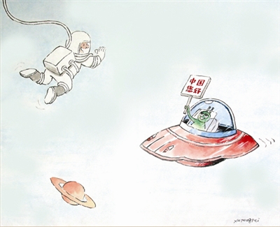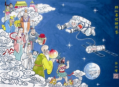 9月25日21时10分,伴随着“神舟七号”飞船的成功发射,10幅漫画作品有幸搭载“神舟七号”,与翟志刚、刘伯明、景海鹏3位航天员一同遨游太空。这些作品是由苗地、孙以增、徐鹏飞、徐进、李玉亭、沈天呈和田如森等漫画家精心创作的。 我国载人航天事业的发展,圆了中华民族千年“飞天”梦,而书画特别是漫画更是人们用于寄托这些梦想的载体。值得赞叹的是,此次“神七”顺利“飞天”,既把画家勾勒在纸面上的心愿变成现实,也让漫画作品进行了一次破“天荒”太空旅行。