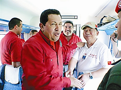 11月13日,委内瑞拉总统查韦斯(中)参加了中国制造动车组从委内瑞拉西部拉腊州卡武达雷到亚拉圭州亚里塔瓜的试车活动。列车进行了10公里的载人试车,途中速度达到每小时120公里。新华社发