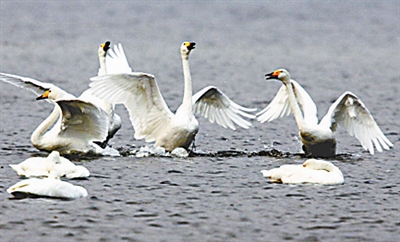 入冬以来,上千只白天鹅陆续飞临山西省平陆县黄河湿地越冬,平陆黄河湿地变成了美丽的“天鹅湖”。 新华社发 薛俊 摄