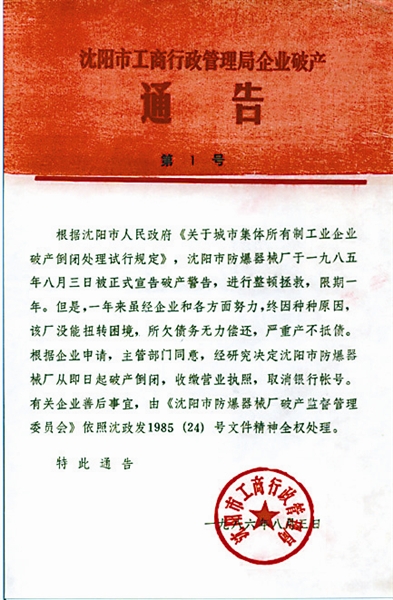 1986年8月3日,沈阳市公开宣告:对经整顿和拯救无效的沈阳市防爆器械厂正式进行破产处理。