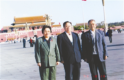 1999年10月28日,韩耀先(中)与石永阶(右)在天安门前留影,搞破产时的“仇人”变成了朋友。 韩耀先 供图