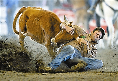 11月16日,2008加利福尼亚专业牛仔竞技大会在加州诺科市举行。牛仔竞技源自牛仔在放牧过程中的各种骑术、驯马和擒牛等技巧,如今演变成有规则观赏性强的竞技比赛,深受北美人的喜爱,每年仅美国专业牛仔竞技协会举办的比赛就接近百场。图为来自加州的选手马特在擒牛比赛中。