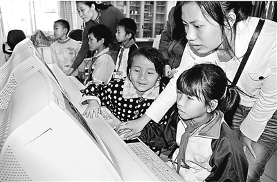 11月17日,农民工子弟在广西工学院图书馆电子阅览室里参观。当日,广西柳州市行知小学6名农民工子弟参观广西工学院,在大学图书馆里,孩子们感受到被知识拥抱的快乐。 新华社发 (黄孝邦 摄)