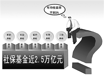 目前,全国各类社保基金积累额近2.5万亿元,但五项基金的年平均收益率不到2%,安全与贬值风险加大。五河 制图