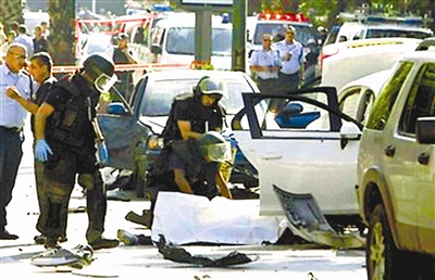 11月17日,以色列城市特拉维夫发生汽车爆炸事件,黑社会标志性人物雅科夫·阿尔佩龙当场死亡,3名路人受伤。警方初步认定这是一起犯罪集团家族间的仇杀。图为警方正在爆炸现场勘查。吉平 供图