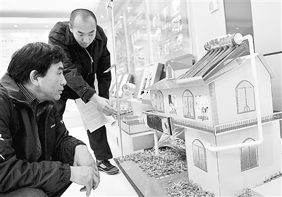 11月18日,两位参观者在观看某厂家设计的环保节能小屋模型。