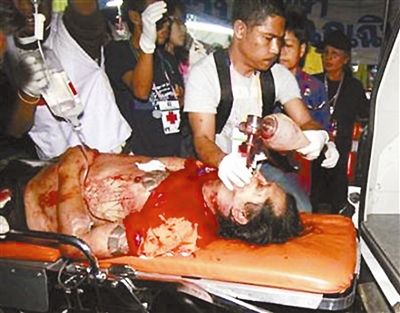 11月20日凌晨,位于曼谷的泰国总理府发生炸弹爆炸事件,一枚炸弹在民盟举行的反政府集会主演讲台前爆炸,造成一名民盟示威者死亡,20多人受伤。图为救护人员正将一名伤者送往医院。吉平 供图