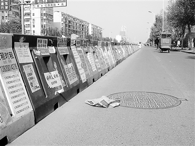天津南开区红旗南路理工大学附近,约千米长的隔离墩上贴满了出租房屋的小广告,大煞风景。 天津市 孙海龙 摄