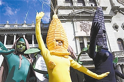 11月20日,在危地马拉首都危地马拉城,一些志愿者戴着本地谷物的道具在街头做宣传,希望人们养成吃本国谷物的习惯,以减少对进口粮食的依赖。肖劼 供图