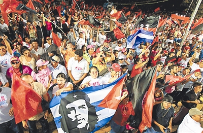 11月20日,尼加拉瓜执政党桑地诺民族解放阵线(桑解阵)的支持者走上首都马那瓜街头庆祝胜利。当天,尼加拉瓜最高选举委员会公布2008年尼全国市政选举最终结果,桑解阵以绝对优势获胜。 新华社发(海罗·卡伊纳 摄)