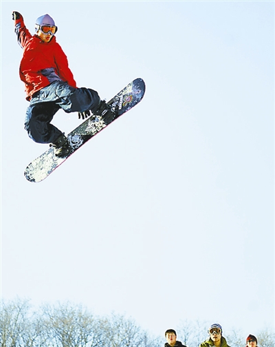中国东北首家按国际标准建设的单板滑雪公园在长春莲花山滑雪场开园。该公园内设自由式空中技巧、单板U型槽等项目,来自各地的单板滑雪发烧友在开园仪式上亮相表演。图为11月23日,一名单板滑雪爱好者在开园仪式上表演。新华社记者 王昊飞 摄