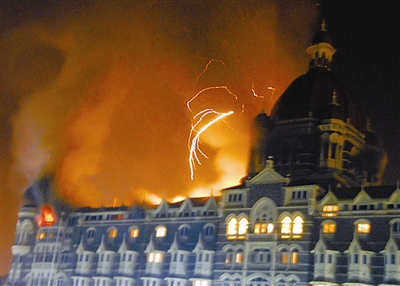 11月27日,印度孟买的泰姬玛哈酒店遭恐怖袭击后发生火灾。新华社/美联