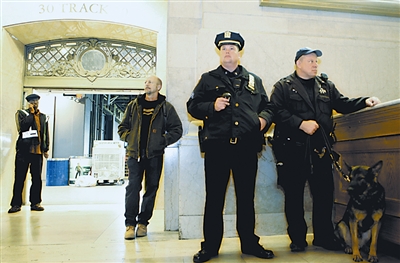 11月26日,在美国纽约的大中央车站,两名警察携警犬在铁路站口警戒。当日,美国联邦政府发出警告,纽约地铁和铁路系统有可能在节日期间遭到恐怖袭击,敦促当地执法部门加强安全保卫。新华社记者 侯俊 摄