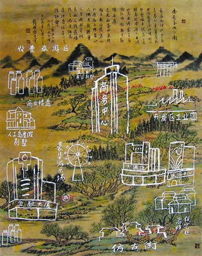 这张画的背景是清代王荤的《杏花春雨江南》,临这张画我用了四天,很认真地临,因为只有这样到最后用那些粗糙的线条“毁坏”它时,我才能真切感受到传统文化被扭曲遗忘、青山绿水被楼台亭阁覆盖的痛心。画中没有人物,但是我觉得每一个观者和我一样都生活在那些粗糙的线条里,偶尔从那些线条的缝隙遥望一下我们曾有的青山绿水和文化。我希望的是,能在《改造规划》之前,改造一下我们的观念。
