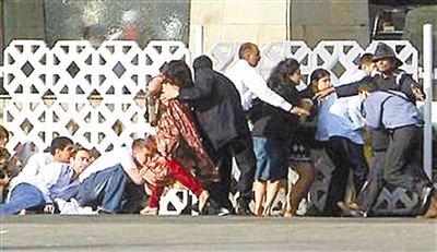 11月28日,恐怖分子被控制在泰姬酒店一楼或二楼,并已经受伤;酒店大火已被扑灭。特别行动部队正组织疏散群众躲避枪弹。吉平 供图