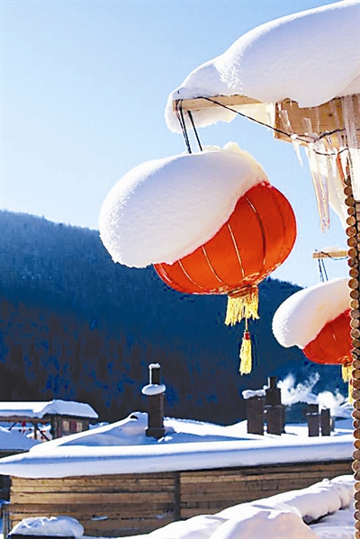 傍晚时分,天色渐暗。我们站在小客栈门前,只见半米厚的积雪中清出一条窄窄的小道伸向远山,披着雪袍的树木在月色中泛着银辉。家家院门上高悬的大红灯笼映得雪地红彤彤的;户户房舍的窗口里都弥漫出一片温馨的灯光。房顶烟囱上的袅袅炊烟融入暗蓝色的夜空……