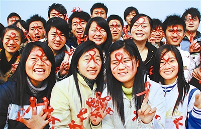 11月29日,一群湖北民族学院的大学生脸上画着红丝带,以此唤起人们对即将到来的世界艾滋病日的关注。