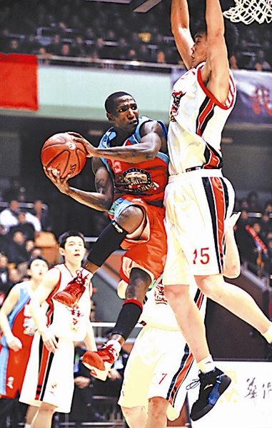 11月30日,在2008-2009赛季CBA联赛第七轮比赛中,新疆广汇队客场以106比96战胜山东黄金队。图为新疆广汇队球员艾伦(左)在比赛中突破。 新华社记者 范长国 摄