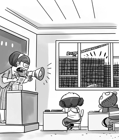 据《现代快报》报道,南京夹岗门小学因京沪高铁和南京南站配套工程施工,被列为拆迁范围,可由于学校暂时无处搬迁,为施工和教学两不误,学校校园被劈成两半,一半作为工地施工,另一半继续上课。学校给每个老师配备了小型扩音器,大型吊装机的吊臂不时在操场上空伸来缩去。
