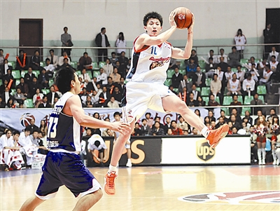 12月2日,在2008-2009赛季CBA联赛第8轮比赛中,广东东莞银行队主场以122比110战胜上海西洋队。图为广东队球员刘晓宇(右)在比赛中分球。新华社记者 刘大伟 摄