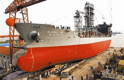 2005年6月8日,江苏南通一民营企业建造的10700吨级散装水泥轮“环球一号”顺利下水。丁晓春 摄