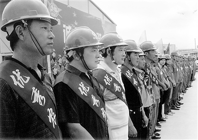 中国中铁武广客运专线广州制梁场建立与农民工同劳动、同生活、同学习、同参与、同娱乐的“五同化”管理机制,激励了更多的外协队伍为企业争光添彩,实现了企业、社会的和谐发展。图为在劳动竞赛活动中获奖的农民工披红挂彩地与企业员工一起站在领奖台上。