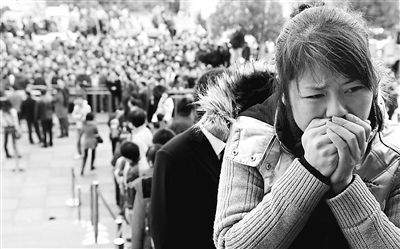12月4日,2008年河南省冬季人才交流大会在郑州举行,一名在寒风中等得瑟瑟发抖的女生在等待进入会场,以求找到一份好工作。当日,数万名求职者拥向河南省人才交流中心,场面极其火爆。由于求职者过多,场面几度失控。 沙浪摄