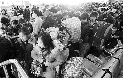 12月7日,外来务工人员及家属们在杭州火车站候车室排队等待检票。