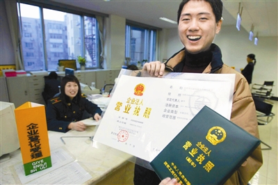 当天,到市内各行政办事大厅的“工商办事窗口”正式提出申请并经名称核准创办“一人公司”者共有16人,其中3人在当天正式取得《工商营业执照》。毛孩儿 摄