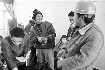 12月5日,刚刚领到3915元拖欠工资的农民工胡夕文(中)高兴地和工友交谈着。当天上午,安徽省含山县劳动保障部门集中为18名农民工发放拖欠的工资共计5.3862万元。从12月初开始,含山县组织县劳动保障、公安、总工会等部门成立联合执法检查组,集中时间,在全县范围内开展农民工工资支付情况专项检查活动。田斌峰 摄
