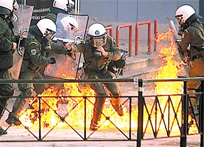 希腊首都雅典和北部城市萨洛尼卡12月6日晚至7日凌晨发生骚乱。骚乱由一名少年之死引发,数百人上街抗议,一些示威者与警察发生冲突,并向警车投掷石块和燃烧瓶等。图为防暴警察正在躲避一枚燃烧瓶。吉平 供图