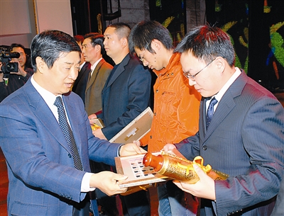 中国移动通信集团公司党组书记、副总裁张春江为“抗地震”先进个人颁奖
