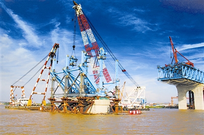 “仅以大胜关大桥为例,大桥钢梁8.23万吨,是武汉长江大桥的4倍,是‘鸟巢’的2倍。钻孔桩2355根、钢筋8.06万吨,混凝土总量将达到122万立方米。这些对于机械制造、工程建筑材料等行业是一个巨大的利好。”王勇平介绍说。