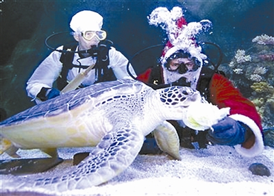 动物也能享用圣诞节大餐了。图为12月9日在德国西部城市奥伯豪森,两名潜水员正在用特制的“圣诞节大餐”喂水族馆里的海龟。直到圣诞之夜,水族馆里的居民们还能听到圣诞歌曲。肖劼 供图