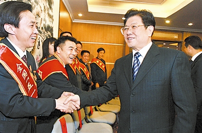 12月10日晚上,湖北省向在京湖北籍农民工送文化首场演出在北京国安剧院举行,演出开始前,中共中央政治局委员、全国人大常委会副委员长、中华全国总工会主席王兆国亲切会见了在京务工的湖北籍农民工先进模范代表。本报记者 杨登峰 摄
