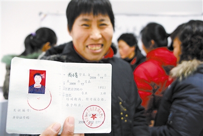 12月11日,山东滨州。滨城区返乡农民工尚小喜经过一个月的免费培训后,在滨城区劳动就业服务处领到了微机操作专业结业证。滨城区政府积极采取措施,搭建学习平台,免费为返乡农民工进行知识技能培训,让他们获得再就业的知识技能,实现重新上岗。目前已培训微机操作、市场营销、美容美发和家政服务等专业的返乡农民工500余人,受到返乡农民工欢迎。李荣新 摄