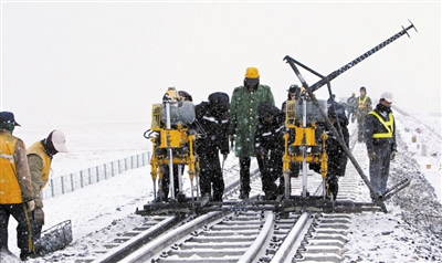 入冬以来,西藏北部地区出现多次降雪冰冻天气。负责铁路养护的员工克服重重困难,对青藏铁路线路设备进行精心养护。这是铁路养护公司员工在海拔5000多米的唐古拉山一带清理青藏铁路铁轨冰冻。(12月9日摄)